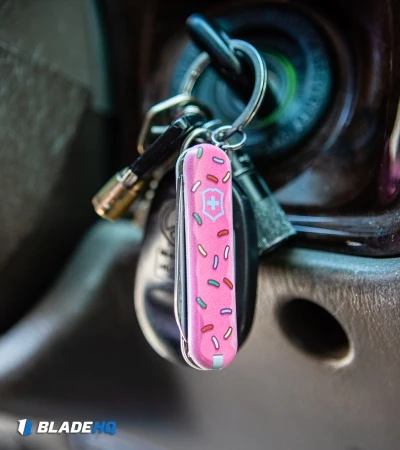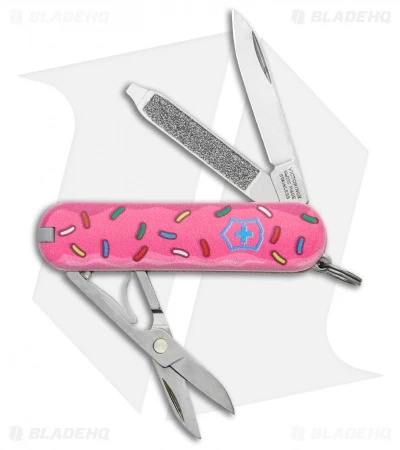 This Blade HQ Exclusive Victorinox Classic SD model is next up in the line of Dessert Warrior knives. We know it looks delicious, with its pink frosting, sprinkles, and delightful golden brown underside, but don’t eat it. That might hurt a little, and certainly wouldn’t taste good.