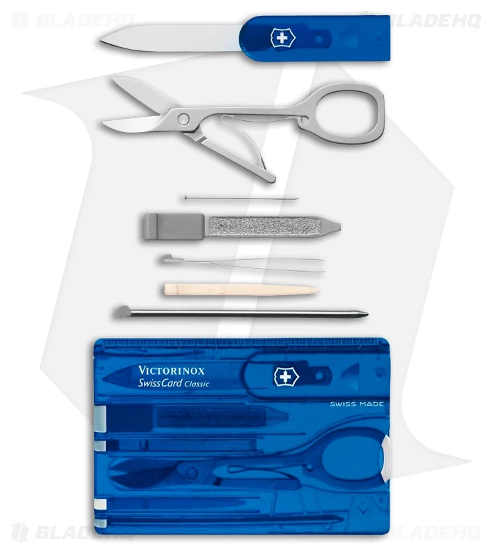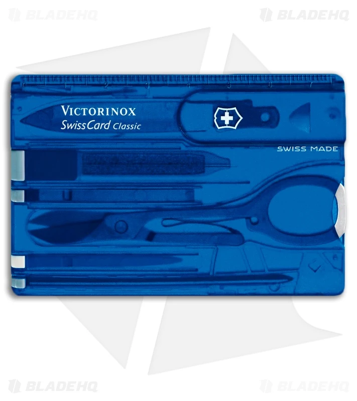 The Victorinox Swisscard is a cleverly-designed, slim multi-tool that makes a worthy everyday companion. Measuring in at 3.19″, it is sized to fit into the credit card slot of your wallet or purse. Despite this compact design, the Swisscard packs some punch in functionality with ten implements to cover a variety of daily tasks. This one is blue.